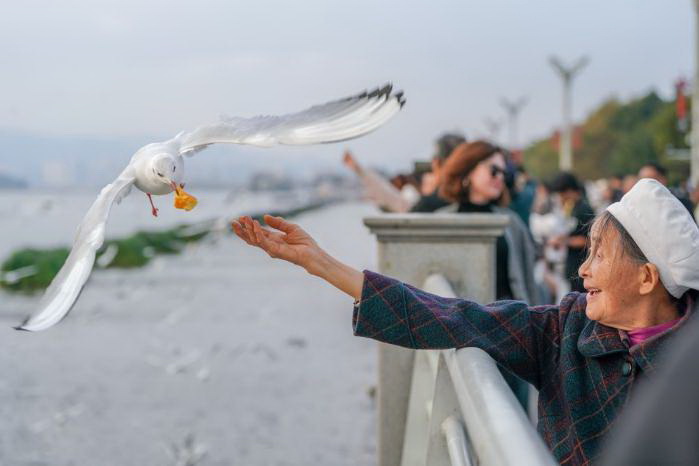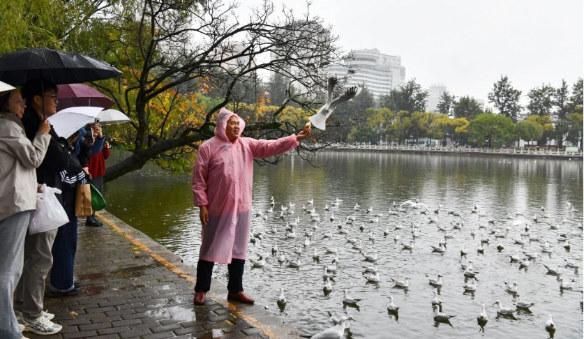 首批红嘴鸥抵达翠湖公园,游客雨...