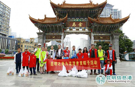 “昆明之美”为流浪者发粽子活动在金马碧鸡坊举行,很多志愿者带着孩子参加活动,培养孩子的爱心和社会责任感。志愿者沿着三市街、南屏街、正义路一边寻找流浪者,一边发粽子和咸鸭蛋,志愿者鲜艳的马甲成为一道靓丽的风景线。