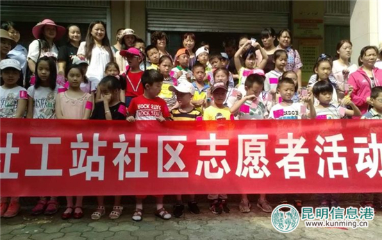 昆明信息港讯 实习记者甘凌菲 7月30日,福海街道办事处阳光社区社工站联合社区居委会、志愿者共同组织社区居民开展社区志愿者活动。60余名家长和儿童组成了“环保小队伍”“社区小记者”以及“文明倡导小队伍”三个分队,分别在社区人员集中路段开展捡垃圾、问卷调查、规范停放自行车等活动。