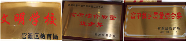 昆明市第十七中学创建于1957年,现有22个教学班,1200余学生。在全体教职员工的努力下,学校在2016年12月29日顺利通过了国家教育部义务教育均衡发展评估验收,学校工作得到了检查专家组的高度认可和评价!在官渡区教育局2017、2018、2019年终考核中,学校综合目标考评和党建目标考核连续两年获得一等奖!在官渡区教育系统2017、2018、2019组织的“金钢塔”杯艺术节中,学校编排的舞蹈节目连续三年获官渡区教体系统第一名并在昆明市的比赛中获得二等奖;2019年学校参加由昆明市教体局、昆明市环保局、昆明市滇管局联合组织的“我和滇池有个约”环保主体诗歌比赛中在三十多所学校中脱颖而出,荣获中学组银奖,同时荣获优秀组织奖、优秀原创作品奖、优秀指导教师奖!