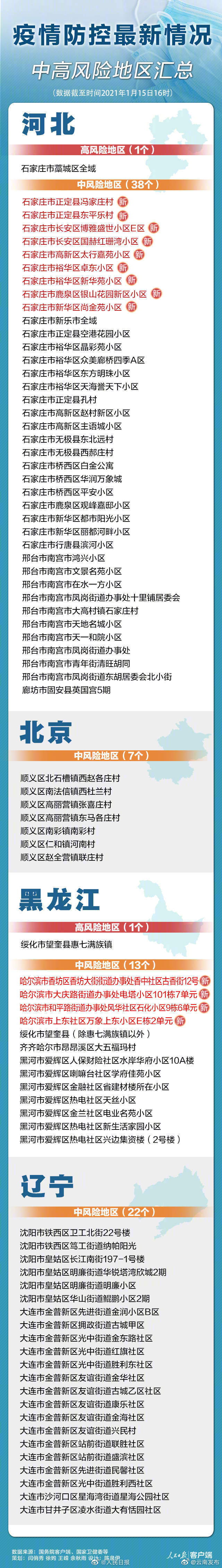 截至1月15日16时,河北省有1个高风险地区、38个中风险地区,北京市有7个中风险地区,黑龙江省有1个高风险地区、13个中风险地区,辽宁省有22个中风险地区……更多中高风险地区情况汇总,戳图了解↓↓ (@人民日报)