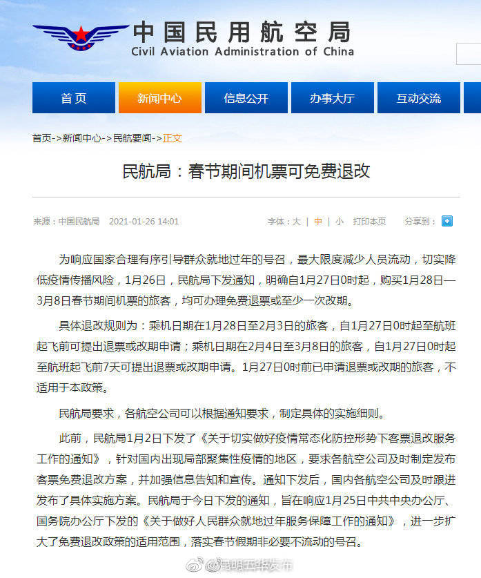 此前,民航局1月2日下发了《关于切实做好疫情常态化防控形势下客票退改服务工作的通知》,针对国内出现局部聚集性疫情的地区,要求各航空公司及时制定发布客票免费退改方案,并加强信息告知和宣传。通知下发后,国内各航空公司及时跟进发布了具体实施方案。民航局于今日下发的通知,旨在响应1月25日中共中央办公厅、国务院办公厅下发的《关于做好人民群众就地过年服务保障工作的通知》,进一步扩大了免费退改政策的适用范围,落实春节假期非必要不流动的号召。(中国民航局官网)(@新华网)