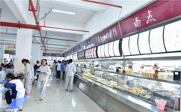 在校园内,一座四层楼的漂亮建筑格外醒目,这就是学校餐厅。学生食堂有汉族餐厅和回族餐厅,饭菜可口,安全放心。每天,它为日出而起的莘莘学子带来美味早餐,为晚自习后饥肠辘辘的勤奋者提供营养补给,高考期间的营养专供、元宵节的汤圆、端午节的粽子等等,飘香的饭菜,安全可口,营养健康,色香味美。
