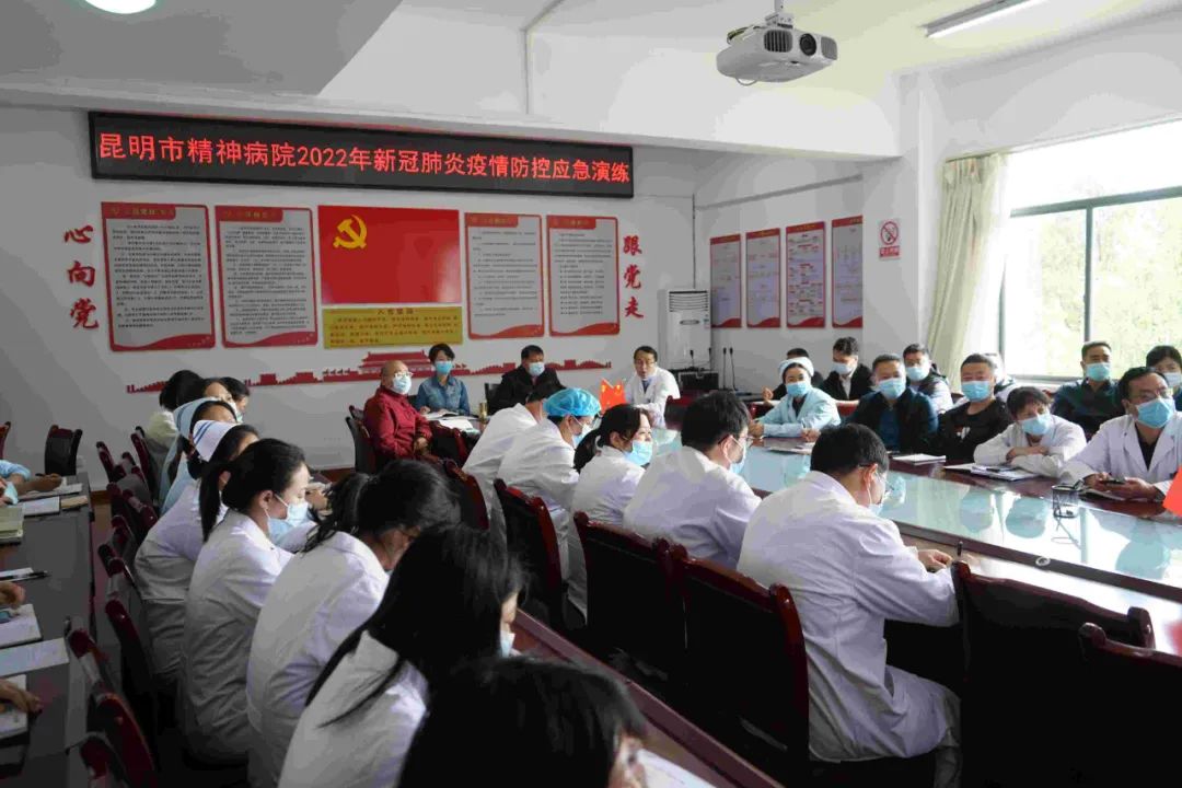 推演由院党总支书记王玮婧同志主持,院长李幼章同志宣布“昆明市精神病院2022年新冠肺炎疫情防控应急预案演练开始”。之后由院疫情防控办公室进行场景推演。此次演练模拟化验室核酸检测一名住院患者核酸检测阳性,模拟设定疫情后,对发生疫情时各岗位工作人员该如何上报疫情进行处理的演练。整个过程演练检验了昆明市精神病院医务人员在接诊、分诊、流行病学调查、疫情报告、隔离消毒、转运转送过程中的防控知识及技能,以及医护人员对防控装备的正确使用,同时也有效地检验了我院的组织协调能力、应急处置能力,全面梳理了疫情防控处理流程。