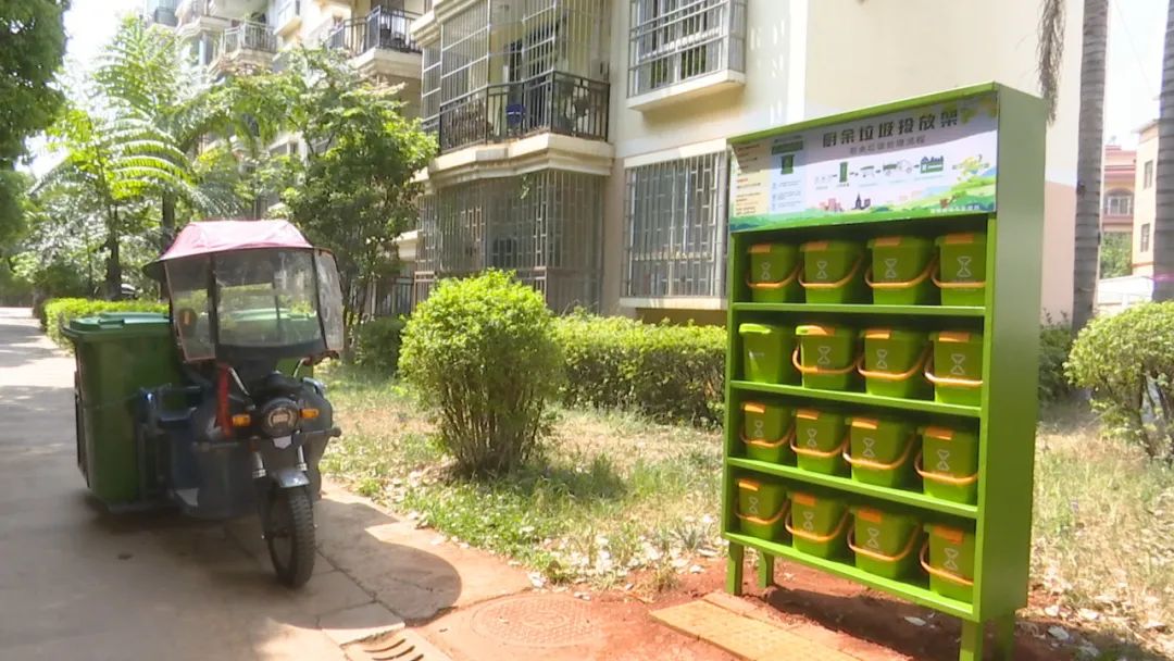 金叶花园小区内,一共建设了10个厨余垃圾架,垃圾架上摆满了对应住户的绿色小桶,小区居民将厨余垃圾投放到小桶当中,再通过“嵩明垃圾分类小程序”参与积分活动,积分达到一定数量时,可兑换毛巾、洗衣粉等日用产品。