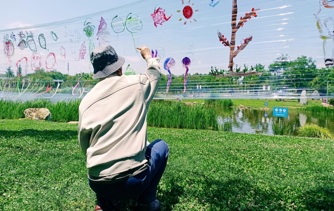 诗歌咏诵结束后,社工和志愿者在树上为伙伴们展开了特制的透明画卷,让他们用色彩勾勒尽情勾勒春天的样子。伙伴们自由地涂鸦,让春色与他们的画融为一体,仿佛漂浮在水面的神奇花朵,令这春天更增添了一份神奇。