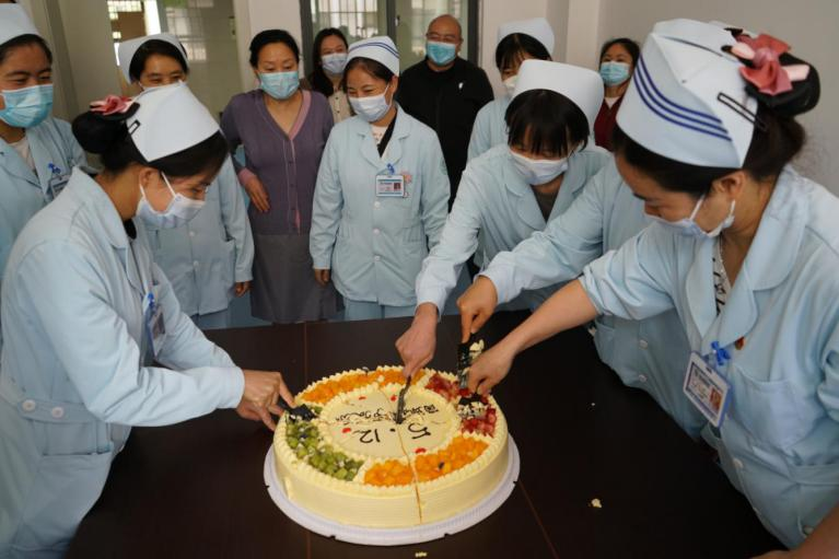 表扬会结束后由王玮婧书记牵头,院领导班子带领护理部、办公室等主要职能部门走进临床一线,带着定制的护士节蛋糕为各科室的护理队伍送上节日祝福。
