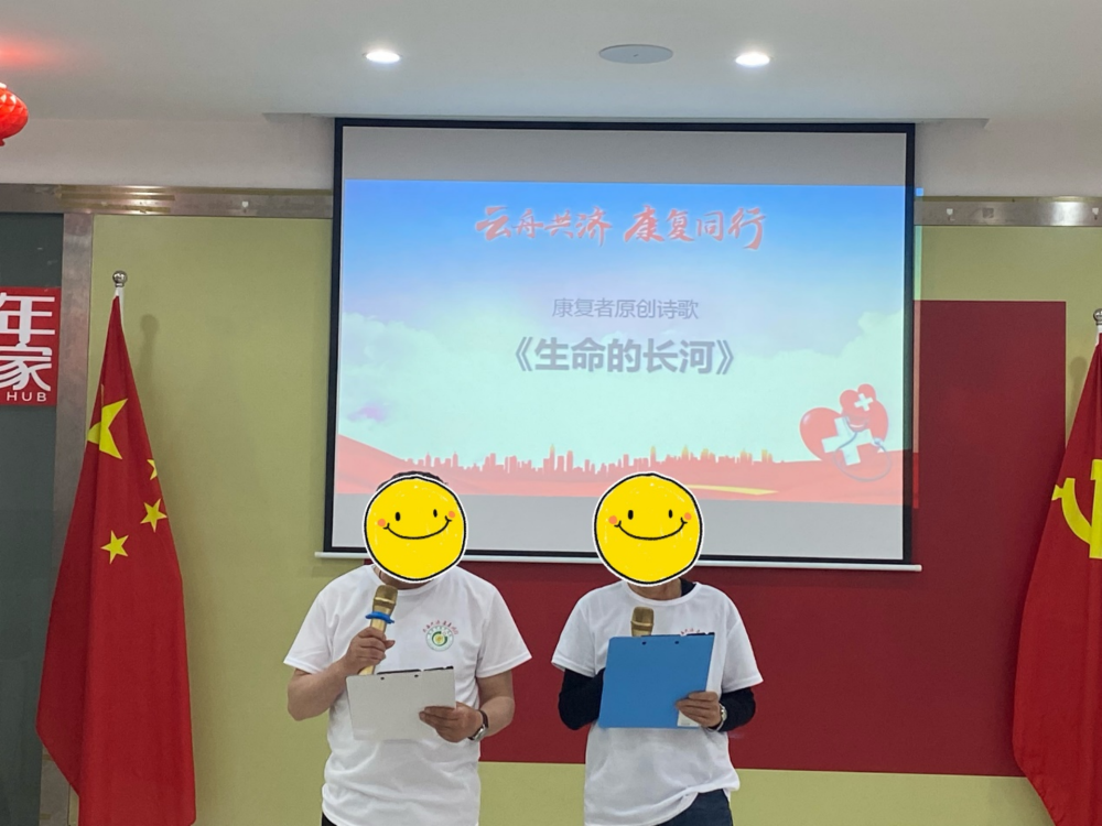接着两位康复者自信地朗诵由他们原创的诗歌《生命的长河》,富有感情地朗读,从“绝望的深谷”“寂静的地方”到“向前奔涌”“不再孤单”,越发坚定的声音如澎湃的潮水击打着听众的心湖,让大家深深地体会到康复者们从过去受到偏见和歧视的痛苦到现在勇敢面对自己、乐观积极生活的自信和阳光。简短而简洁的诗歌,诉说的是精神障碍康复患者的心声与意志,打动的是在场所有人。