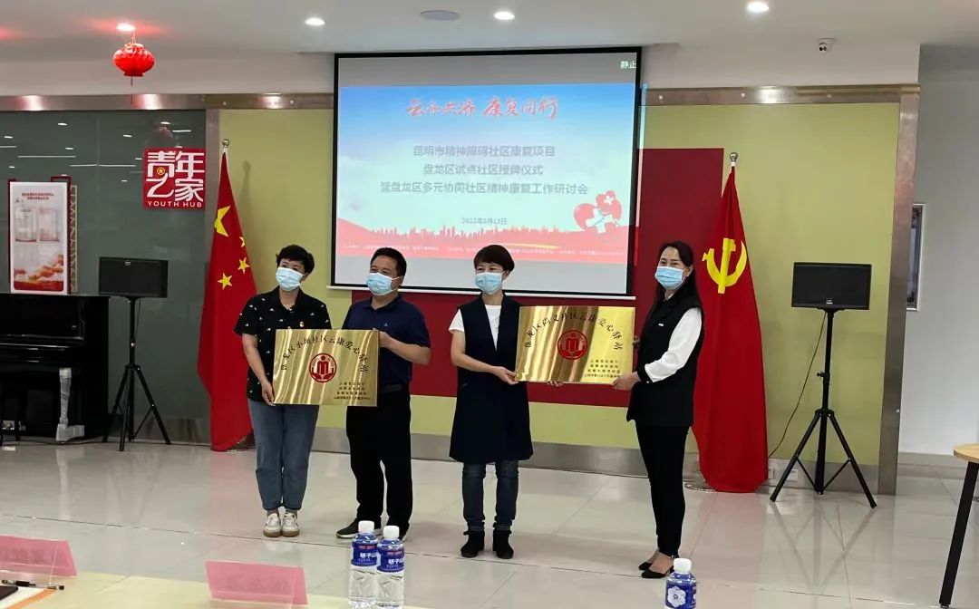 昆明市精神病院党总支书记王玮婧、盘龙区民政局副局长晁吉祥为昆明市精神障碍社区康复项目试点社区盘龙区联盟街道小坝社区和拓东街道尚义社区授“云康爱心驿站”牌。云康爱心驿站的挂牌意味着精神障碍康复者在社区里有了自己的家,有了固定的活动场所保障,更有了社会各界的支持与关注。