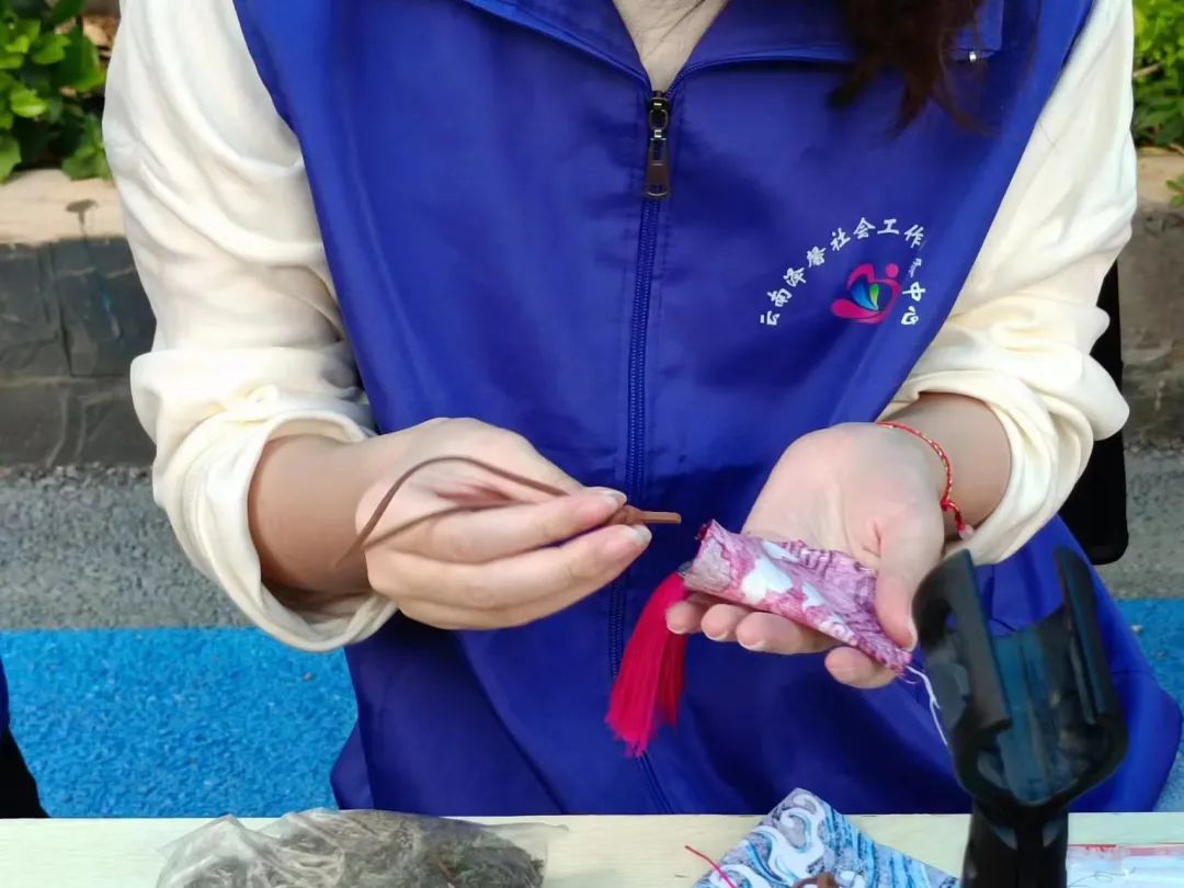 端午习俗体验区的“巧做香囊”活动,由团队成员认真讲解制作流程,协助社区居民完成香囊制作。活动一开始,便吸引了众多居民的眼球,社区居民们纷纷围绕在桌子旁边,选取自己喜欢的布料和流苏,接着细心缝制,装入艾草缝合,最后挂上流苏。虽然过程有些复杂困难,但社区居民们仍然坚持完成制作。在收获一个又一个漂亮可爱的端午节小香囊之后,居民脸上都挂满了满意的微笑。