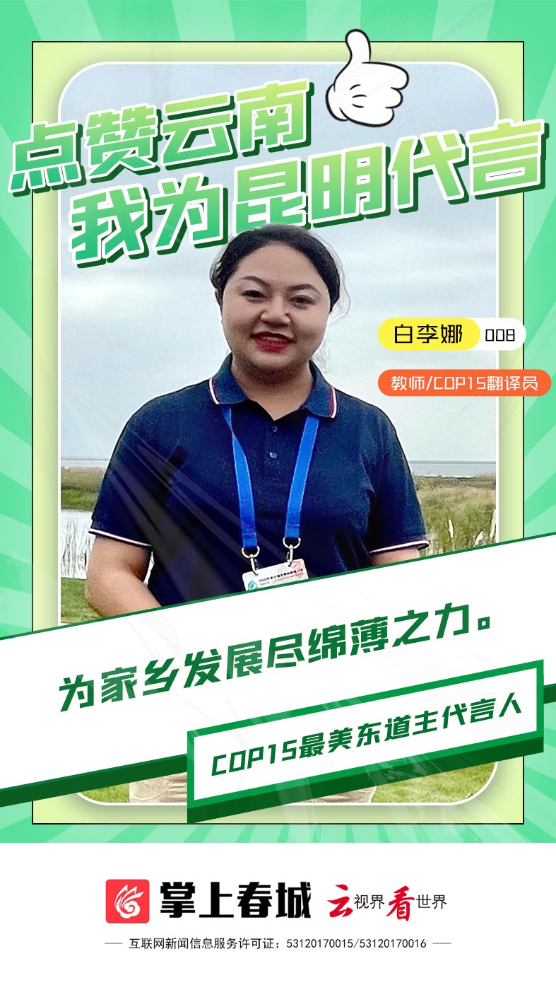 “勇敢、热情、爱挑战”是白李娜生活中的3个关键词。她从小在昆明长大,大学毕业后一直从事教育行业,从课程顾问主管到英语教师,再到29岁时毅然放弃高薪工作,去往英国约克大学继续深造,她最不缺乏的就是从零开始的勇气。“只此一生,一定要坚持做你觉得对的事。”留学期间的白李娜,边打工边学习,最后以优异的成绩取得了教育学硕士学位。这些经历让她练就了流畅自信的表达能力,保持独立的心境,更是成为她被选为COP15翻译员的契机。