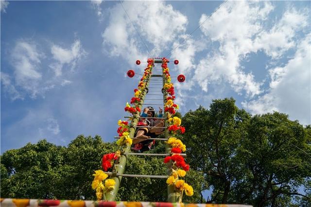 过年期间的阔时节是傈僳族开启一年的重要节日,节日期间,傈僳族人会在硕大的木杆上架起刀刃朝上的天梯,勇敢的青年将跟随师父的步伐,赤脚踩着刀刃向上攀登……这是“上刀山”。
