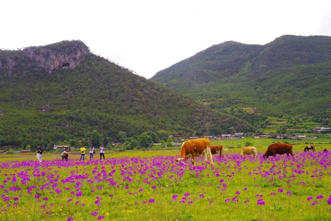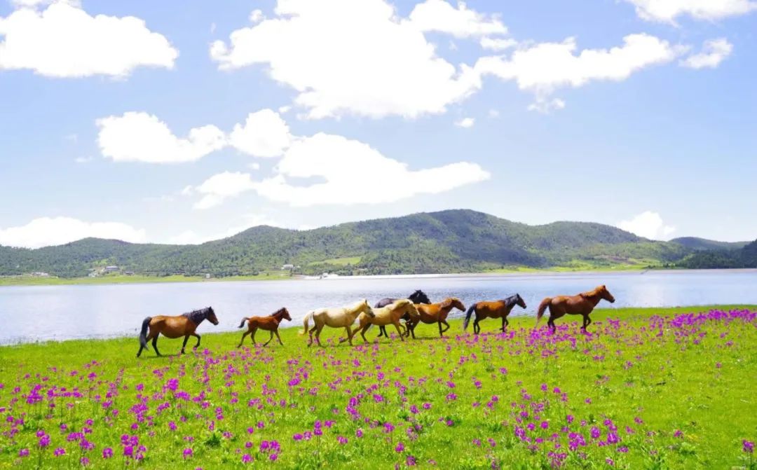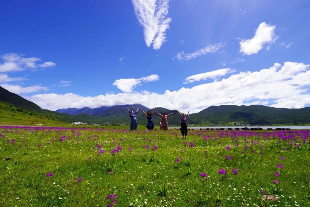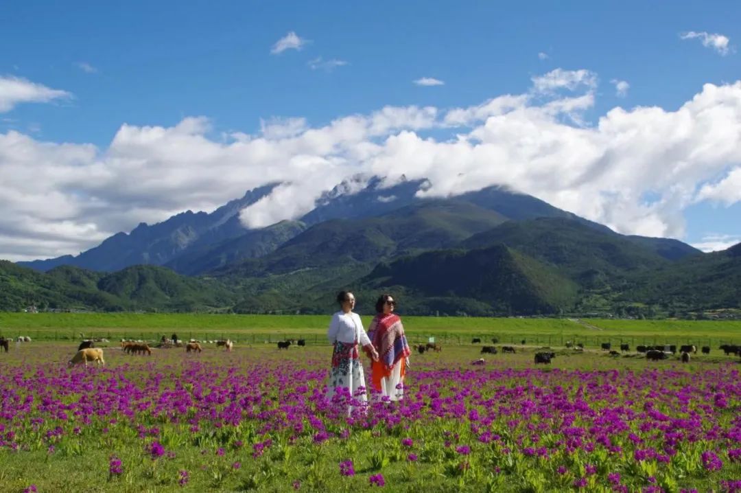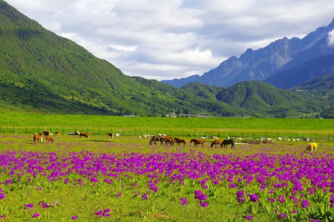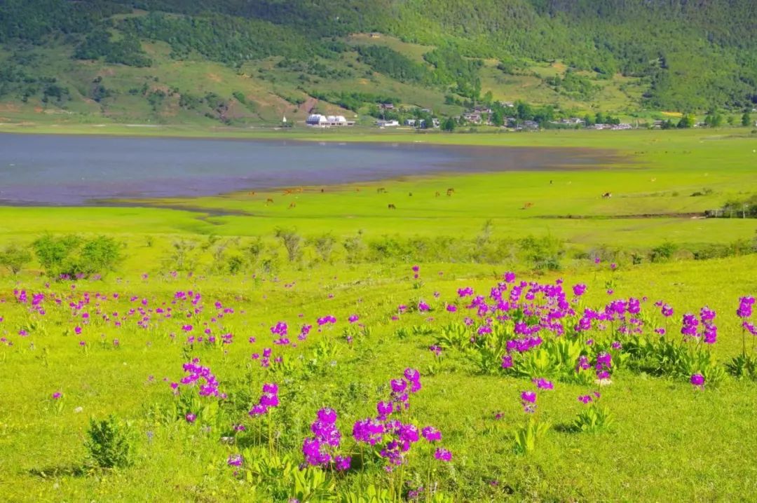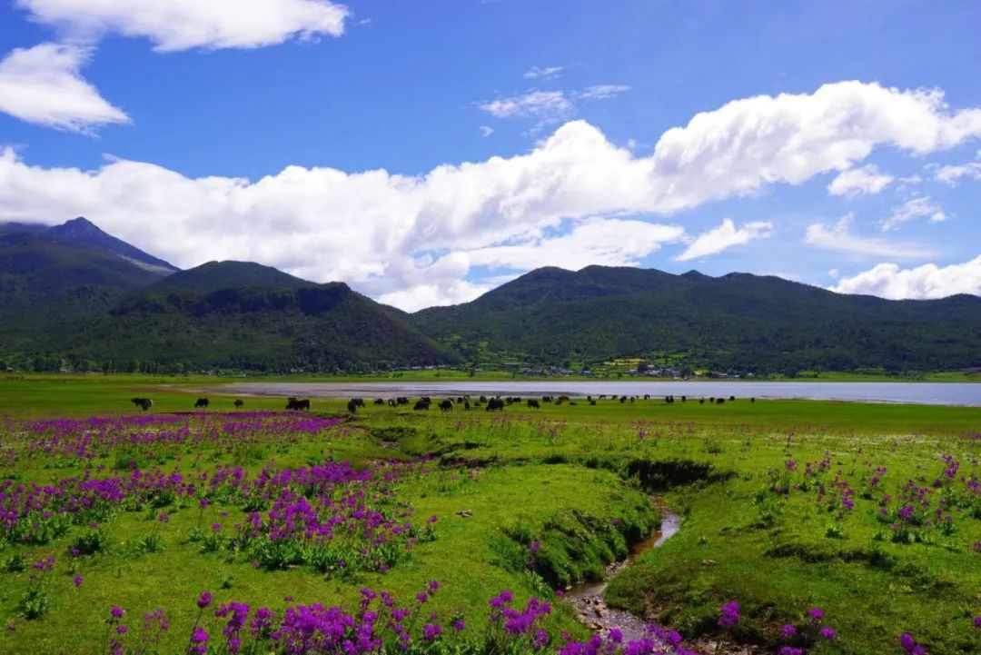 近日,丽江文海的报春花、毛茛花等百花盛开了,那一片片紫、黄、白各色花儿与青草甸、成群的牛羊相伴,雪山、蓝天、白云、碧水为背景,犹如一幅幅巨型的画卷,在毫不吝啬地展现文海的美,迎来了一批又一批游人观花赏景!