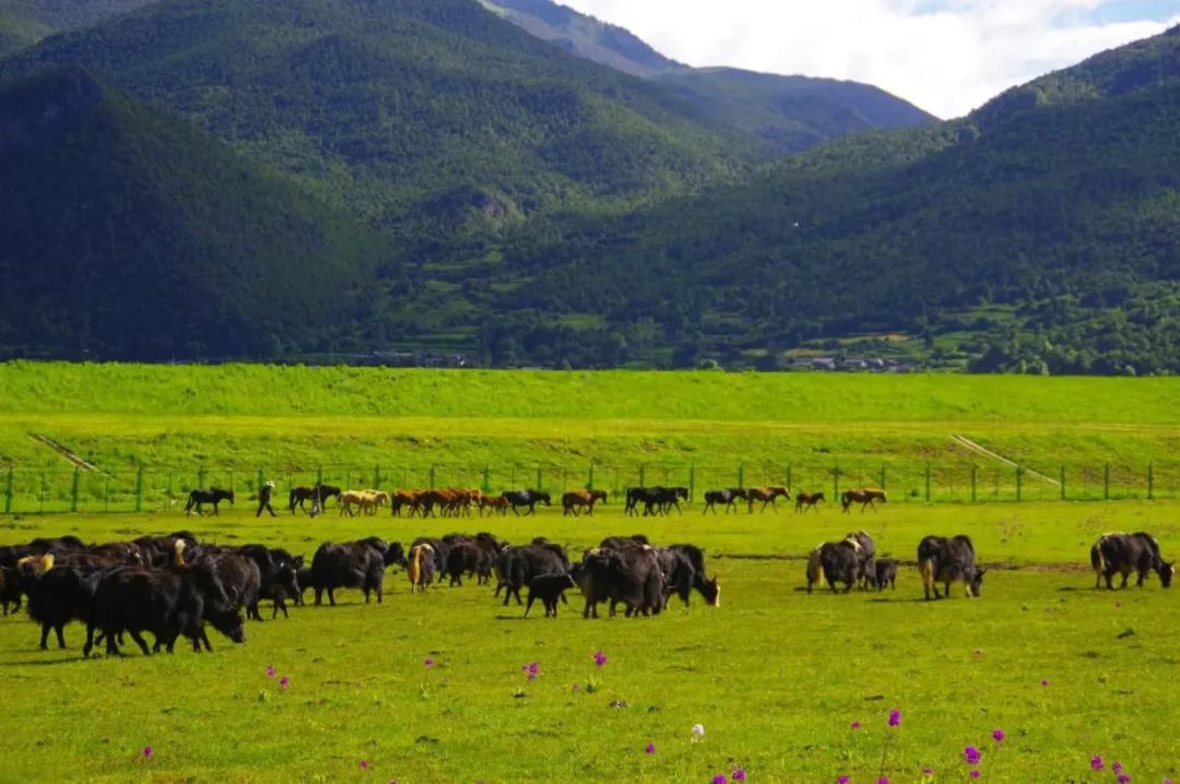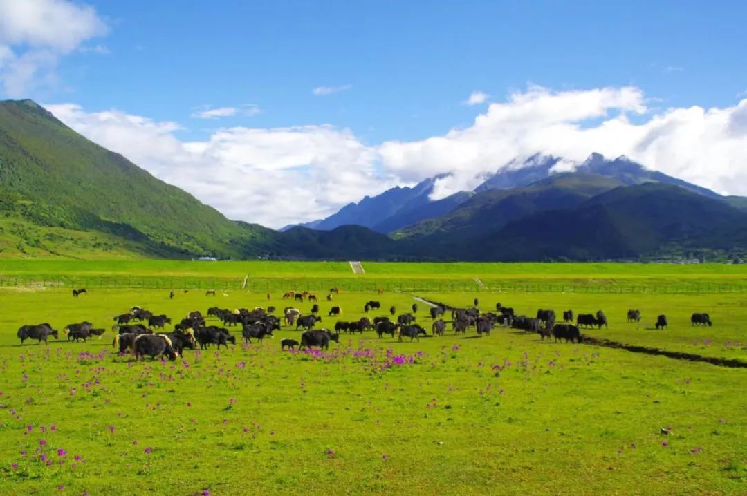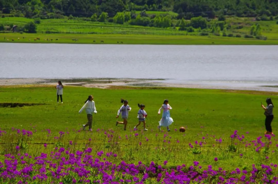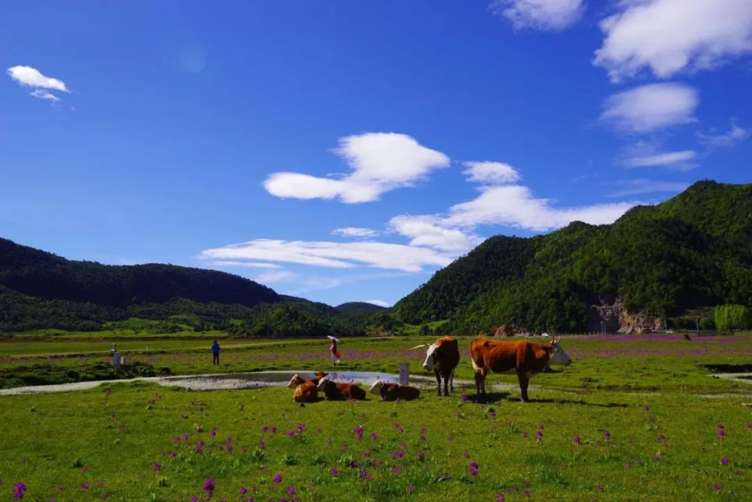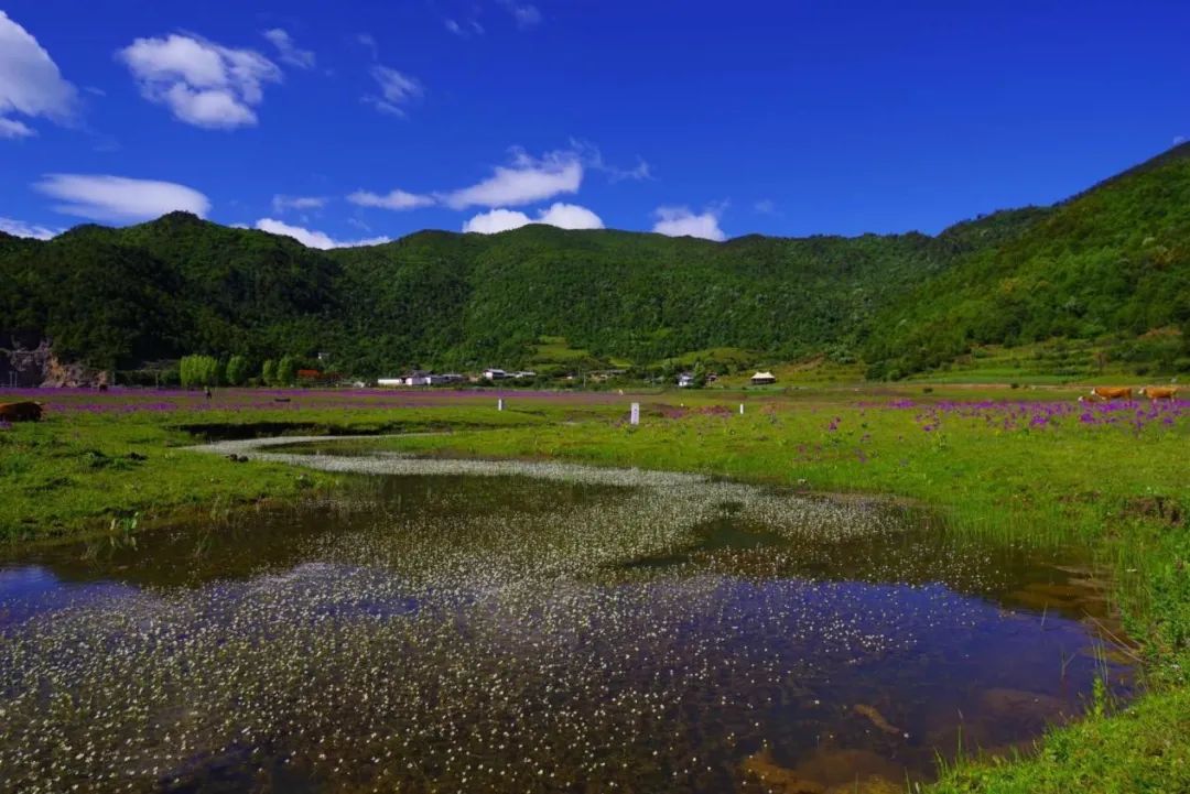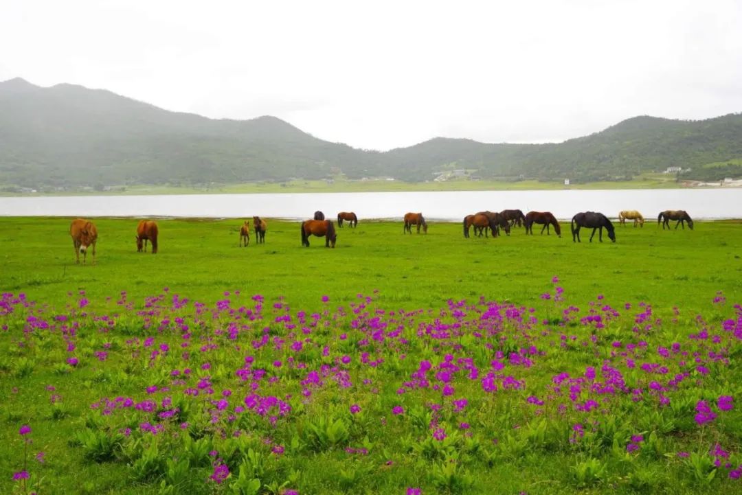 近日,丽江文海的报春花、毛茛花等百花盛开了,那一片片紫、黄、白各色花儿与青草甸、成群的牛羊相伴,雪山、蓝天、白云、碧水为背景,犹如一幅幅巨型的画卷,在毫不吝啬地展现文海的美,迎来了一批又一批游人观花赏景!