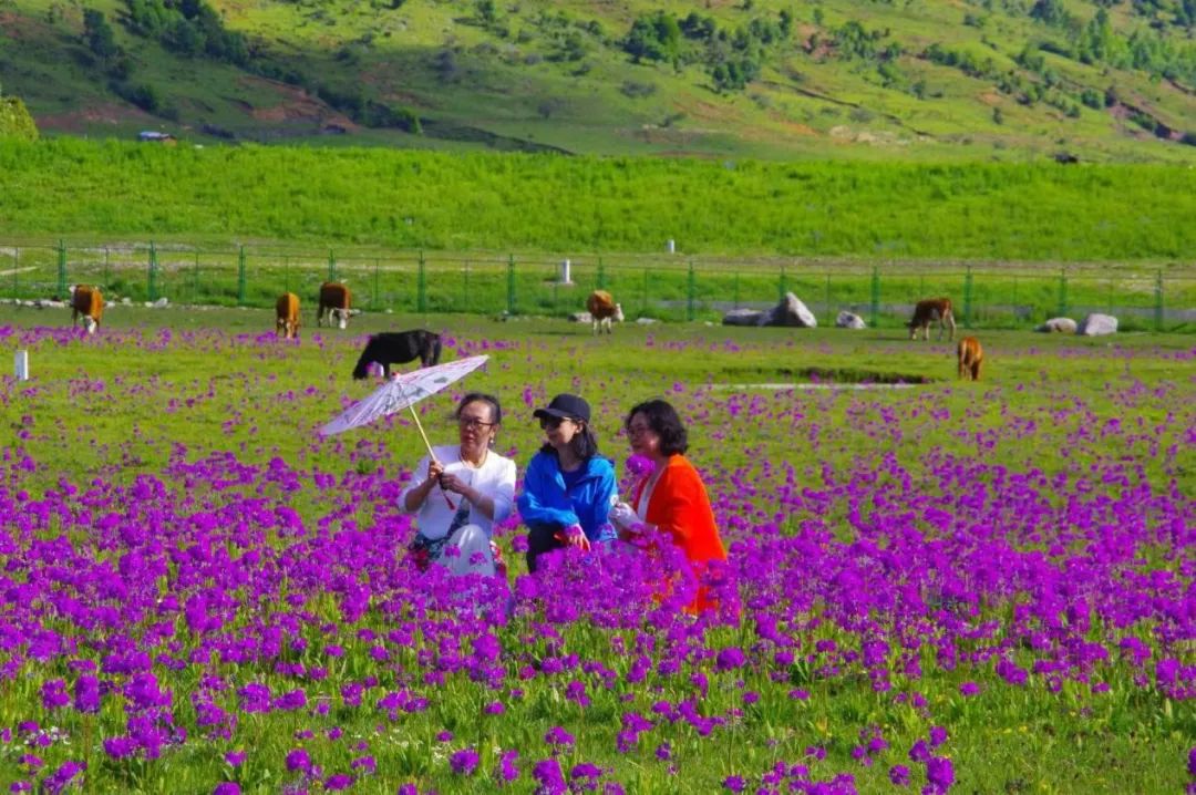 草甸上一群群牛羊、马匹在悠闲自在的啃食着刚刚发出的嫩草,绿草红花,还有熙熙攘攘来观花赏景的人,草甸显得更加生机怏然!