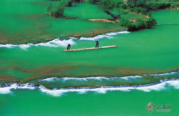 罗平县城东南群山峻岭之中的多依河,滩头密布,瀑布丛生,两岸古榕参天,翠竹遍地,河水剔透碧蓝,清澈见底,远山近水倒映其间,美不胜收。