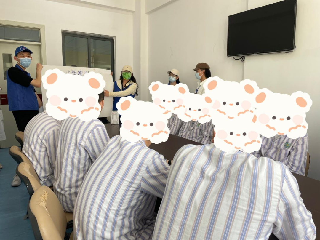 伴随着清晨的第一缕阳光,团队成员走进了医院的男病房区,本次活动我们邀请了12名康复者参与。活动在简洁的开场白中拉开序幕,“我叫小慕,大家可以叫我小慕社工,今天非常开心能够和大家一起做做游戏、聊聊天......”,社工向组员介绍自己的同时说明来意和本次小组活动的目标、目的及具体内容,随后又热情邀请组员自我介绍,组员积极响应,“我叫小刘,喜欢听鸟叫”、“我叫小李,我喜欢流水的声音......”,“我也喜欢鸟叫,我还会模仿鸟叫嘞”。现场氛围在一开始就达到了一个小高潮,欢声笑语中,组员渐渐打开心扉,而我们也在获知组员需求的同时与组员了解了彼此。