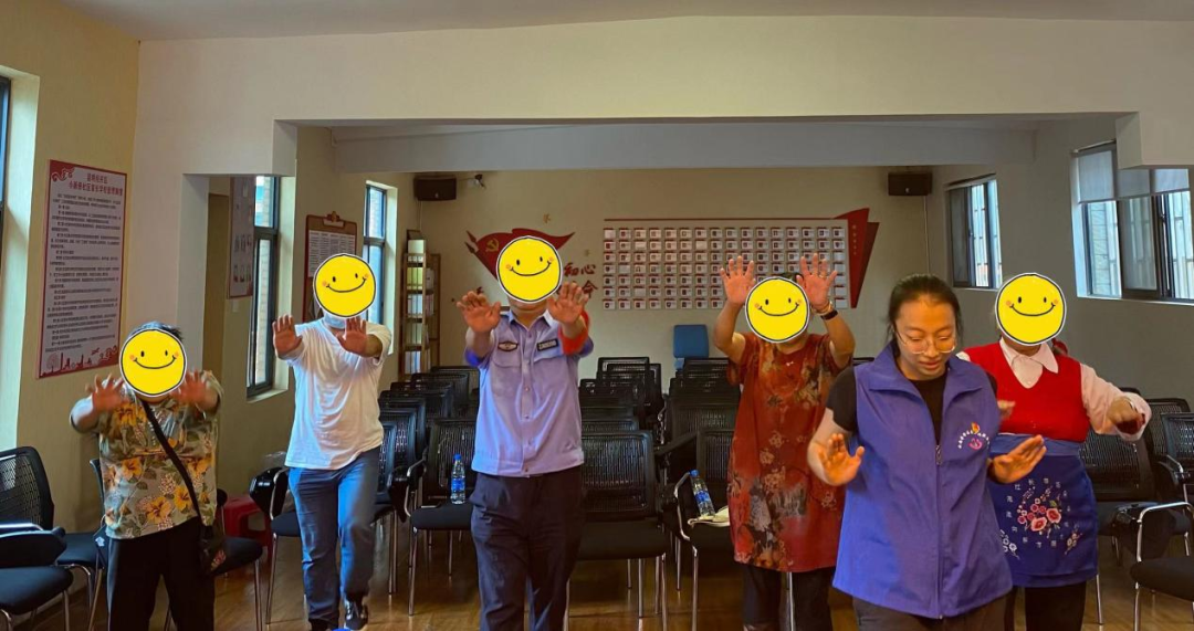 随着讨论的结束,社工总结了科学运动的好处,接着引出了今天的主要环节——“一起学做康复操”。研究表明,每天坚持舒展四肢,适当运动,不仅能够适度缓解神经紧张,改善睡眠健康,恢复康复者的身体协调性和灵活性,而且以小组为团队,共同学跳康复操在一定程度上也能改善组员的人际关系,促进其社会功能的恢复。社工在进行康复操功效宣传和具体运动方式示范后,播放背景音乐节拍,将组员们分成两排站立,通过亲身示范,让组员们慢慢学习。虽然有的组员动作不标准,但是社工能够看出来她们学习得很认真很努力,社工一边鼓励她们,同时也耐心引导。在学完两节康复操之后,组员们都表示想继续学习后续的动作,考虑到有的组员身体情况以及记忆力状况,社工向组员解释,后续的动作在随后的小组活动中会继续为大家教学。为了发挥同伴的支持和榜样作用,激发康复者的优势与潜能,提升其自我效能感,主社工还邀请康复者王叔叔作为带领者,带领组员一起学习,组员们以热烈的掌声对王叔叔表示赞同和支持。
