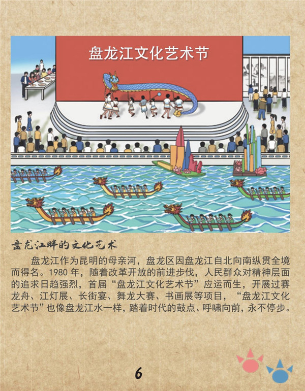 “事实上,我首先是被书里盘龙江文化艺术节的部分吸引,继而才引发了阅读兴趣。”今年63岁的余国忠参加了21届“盘龙江文化艺术节”,对于他来说,这个丰富盘龙区文娱生活的大型盛会已成为自己生活的一部分。机缘巧合下,他在《幸福盘龙 绘就新时代画卷》小人书中“偶遇”了与自己朝夕相处21年的“家人”,内心泛起一丝波澜。