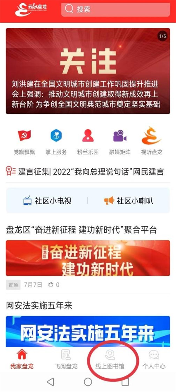 点击线上图书馆,选择“幸福盘龙 绘就新时代画卷”栏目进行阅览。