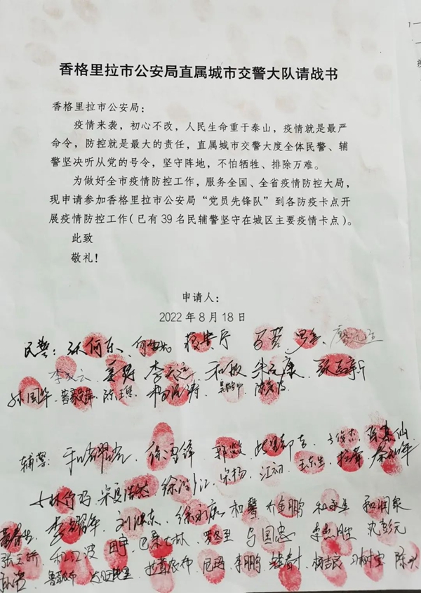 “急难险重公安当先、担当作为我来率先”。8月22日,香格里拉市公安局党委在230名提交请战书的民辅警中又选出39名民辅警,组成“疫情防控共产党员先锋队”,踏上了出藏入滇人员第二批转运的征程……