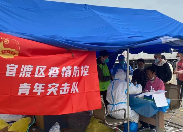昆明信息港讯 通讯员栗莉 李昊 王正鹏 9月6日,官渡区检出1例初筛阳性人员,疫情发生后,共青团官渡区委动员组织广大青年志愿者投身疫情防控一线,携手筑牢抗疫防线。在每一个抗疫点位,处处都有青年突击队的绿色身影,共青团旗帜飘扬在战“疫”最前沿。