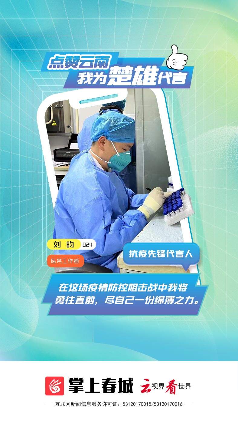 7月22日,2022年云南·昆明网络文化节系列活动“点赞云南 我为家乡代言”手机形象网络征集活动正式启动,面向全省征集典型人物故事,让一个个普通网民成为主角,登上封面为家乡代言,讲云南故事,展云南形象。 活动吸引了市民朋友的广泛关注,自启动以来持续火爆,每天均收到大量投稿,今天登上封面的就是由中共楚雄彝族自治州委网信办推荐“抗疫先锋”代言人刘昀。