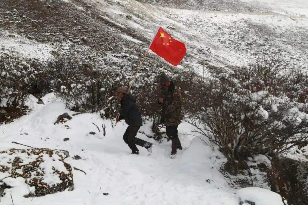 图为索朗群培和明久扎西扛着国旗巡边。来源:“网信西藏”微信公众号