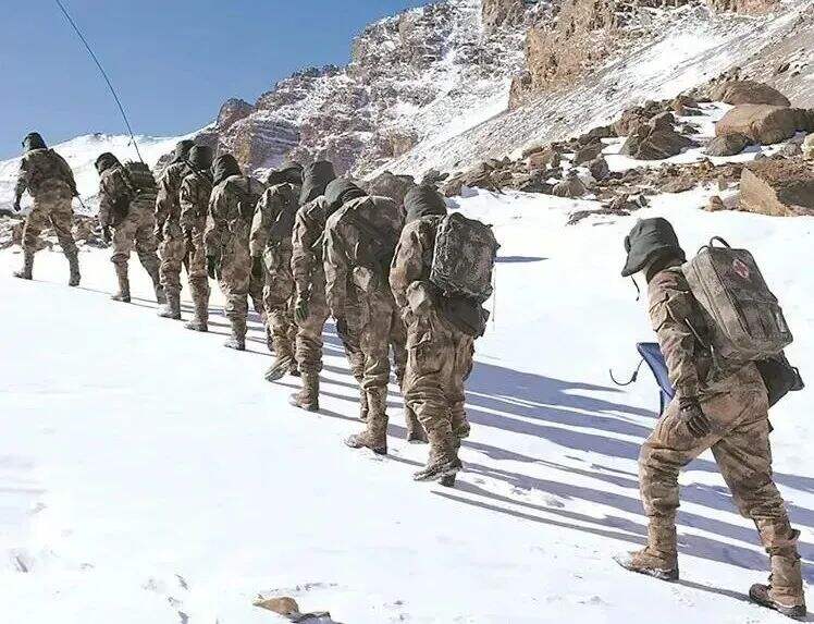 西藏军区岗巴“高原戍边模范营”巡逻分队官兵向目的地挺进。图片来源:解放军报