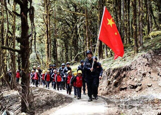 9月,西藏岗巴“雪山红色卫士”边境一线巡逻志愿服务队行进在赴某点位巡逻的路上,“共产党员走前面!”巡逻队负责人、西藏军区某团“高原戍边模范营”营长陈祖元下达命令,军民步调一致。