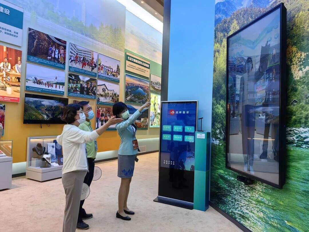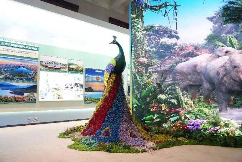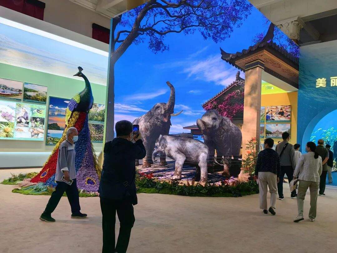 该展项内置云南26个世居民族特色服饰和云南著名景区背景图片,观众可换上民族服装拍照,并扫描二维码下载照片。“哈哈,白族服饰特别适合我,特别清新可爱。”一位观众换上白族女装,与周围的人笑谈起来,其他人也都迫不及待地想尝试。绿孔雀是云南独有的物种,被列为国家一级保护动物,尤为珍贵。而眼前这只头顶直立冠羽,姿态柔美绚丽,栩栩如生的“绿孔雀”,是由勿忘我、蓝星球、红玫瑰、跳舞兰等鲜切花搭建而成的。在它面前,不少参观者都拿着手机拍个不停,也请讲解员来帮忙拍合影。在讲解过程中,展区讲解员回答得最多的一个问题是“这些花是真的吗?”当得到肯定的答案后,来参展的观众都表示既惊喜又向往。