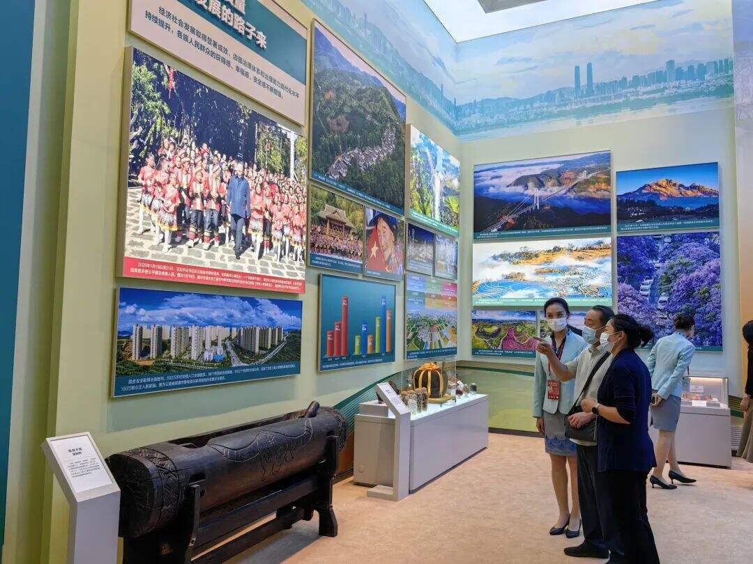 在“坚持推动构建人类命运共同体 开创中国特色大国外交新局面”单元,中老铁路动车交付的图文展板与下方“澜沧号”动车模型相得益彰,正是有了中老铁路,昆明到万象实现了朝发夕至,从此山不再高,水不再长。其他跟云南元素相关的图片、实物也引人驻足,如“七一勋章”获得者张桂梅、云南中老越边境十层大山界碑处的泥土、昆明宣言等。