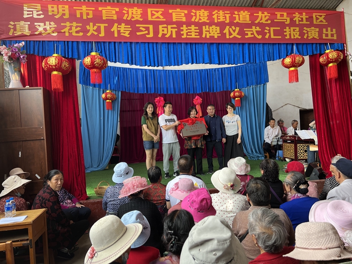 据了解,滇戏、花灯在官渡区具有悠久的民间传承历史,现已列入国家级非物质文化遗产代表性项目名录。多年来,由于城市化进程的不断推进,非物质文化遗产传承空间日渐衰微,为有效传承和保护全区滇剧花灯,日前,经官渡区文化和旅游局、官渡区文化馆非遗保护中心实地调研,官渡区在金刚社区和龙马社区挂牌成立滇戏花灯传习所。在当天的挂牌仪式上,来自辖区的滇戏花灯剧团及民间艺人纷纷登台献艺,为大家表演了《王婆骂鸡》《五台会兄》《打渔收子》《莫愁女》等经典滇戏、花灯戏曲及选段,大家唱风各具特色,手、眼、眉、身、步伐跟着曲调、剧情形式多样、跌宕起伏、扣人心弦,台下的观众们跟着节奏手里打着拍子、嘴里随声哼唱,每到高潮处还纷纷拿出手机摄影留念。