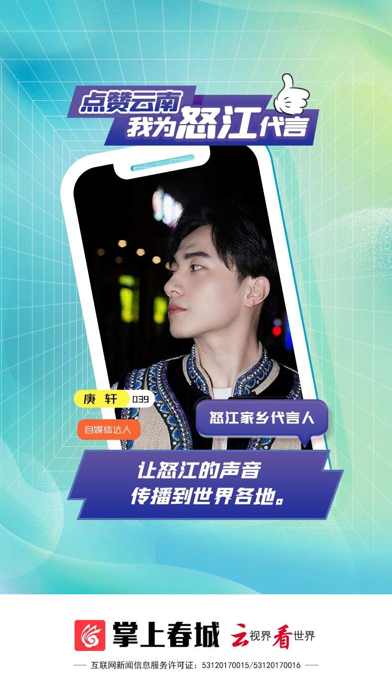 7月22日,2022年云南·昆明网络文化节系列活动“点赞云南 我为家乡代言”手机形象网络征集活动正式启动,面向全省征集典型人物故事,让一个个普通网民成为主角,登上封面为家乡代言,讲云南故事,展云南形象。 活动吸引了市民朋友的广泛关注,自启动以来持续火爆,每天均收到大量投稿,今天登上封面的就是由中共怒江傈僳族自治州委网信办推荐的“怒江家乡”代言人庚轩。