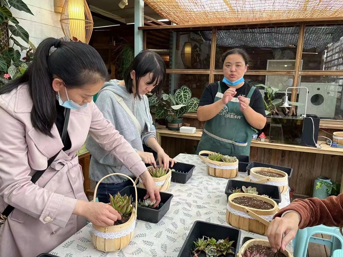 现场,工作人员组织妇女代表们参观花园,了解各种花的习性和特点,邂逅一场花事。大家相互交流哪种花最好看,哪种花比较罕见。随后,大家还变身园艺师,体验多肉盆栽DIY。经过老师的指导,大家发挥奇思妙想,将呆萌可爱的多肉搭出了独一无二的风格。“每个多肉盆栽都蕴藏了希望和信心,我要将它安置在办公桌上,激励着每天为梦想而奋斗的自己。”来自辖区街道的吴女士告诉记者。