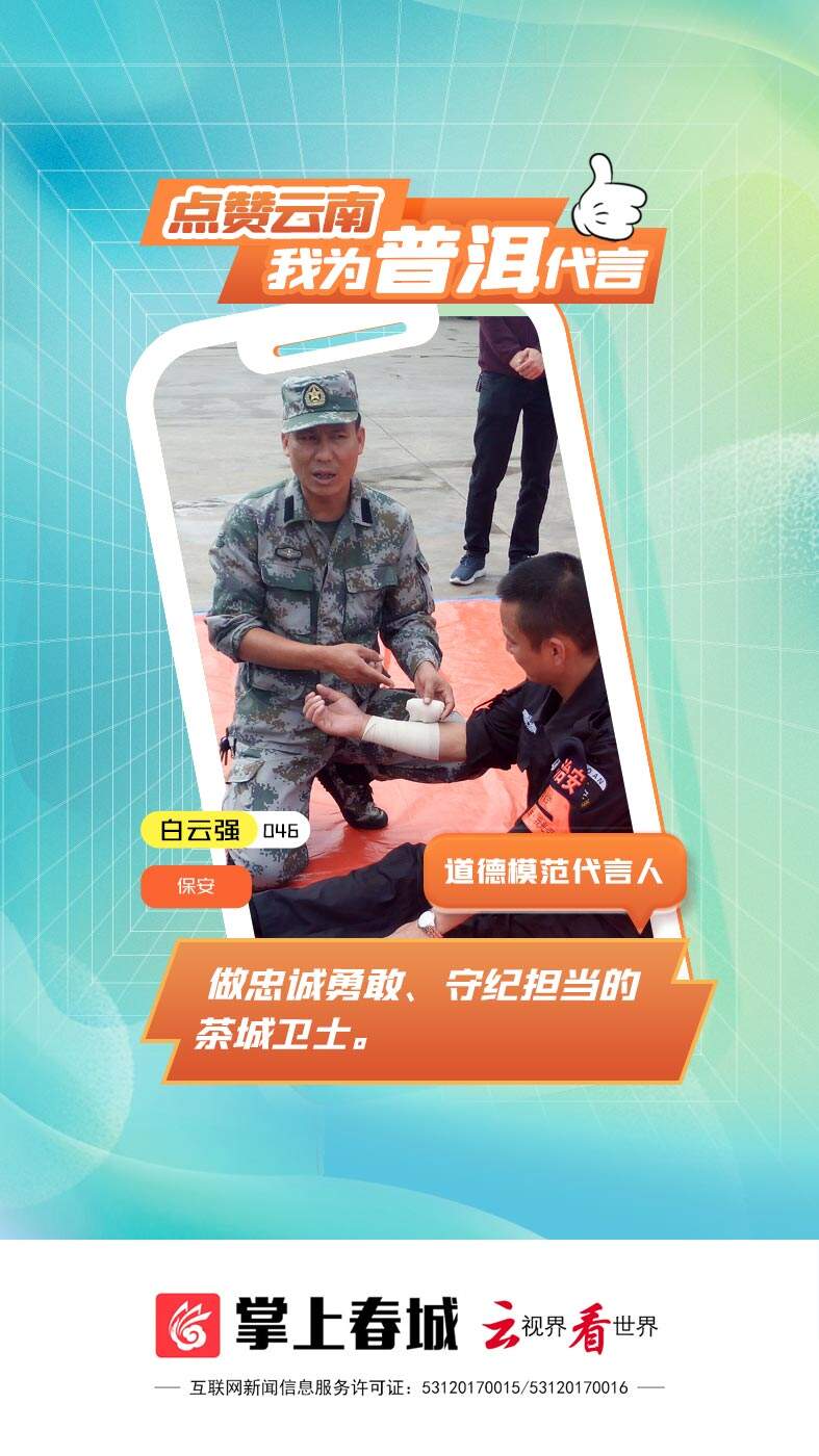 7月22日,2022年云南·昆明网络文化节系列活动“点赞云南 我为家乡代言”手机形象网络征集活动正式启动,面向全省征集典型人物故事,让一个个普通网民成为主角,登上封面为家乡代言,讲云南故事,展云南形象。 活动吸引了市民朋友的广泛关注,自启动以来持续火爆,每天均收到大量投稿,今天登上封面的就是由中共普洱市委网信办推荐的“道德模范”代言人白云强。
