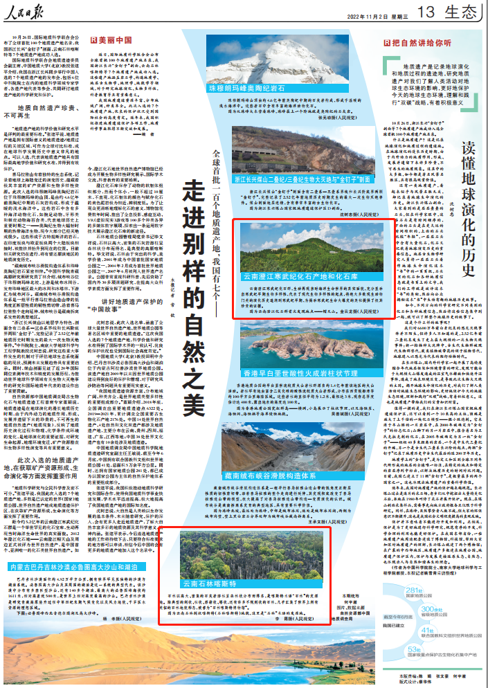 近日,国际地质科学联合会公布全球首批100个地质遗产地名录,我国浙江长兴“金钉子”剖面、云南石林喀斯特等7个地质遗产地成功入选。这些遗产地涵盖岩石学、构造地质学、地层古生物学、地理学、地貌学等领域,对于研究地球演化、生物多样性,科普教育等具有重要意义。