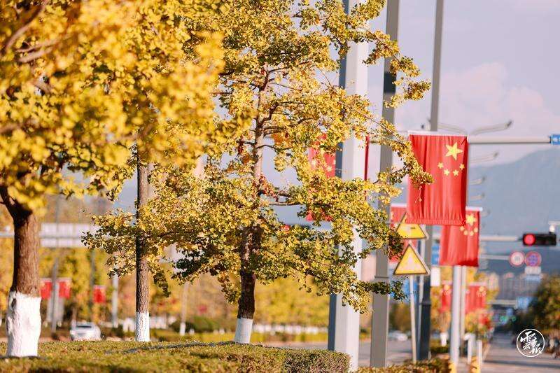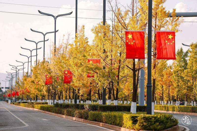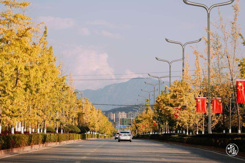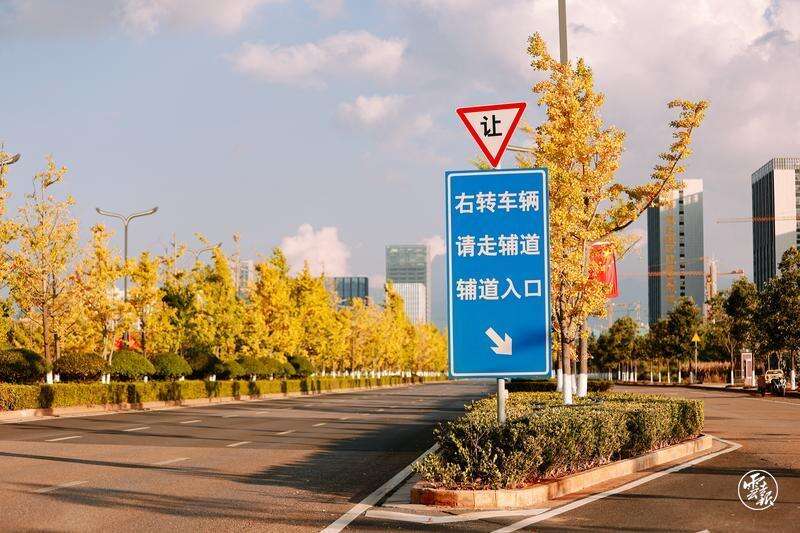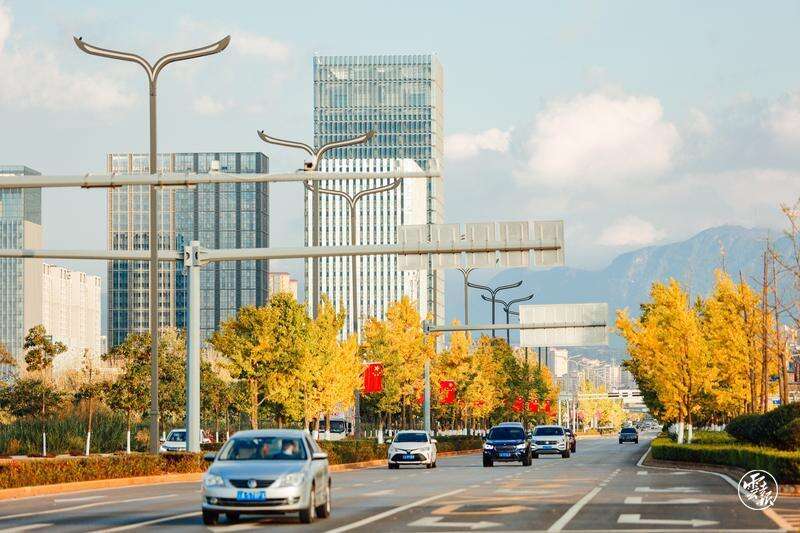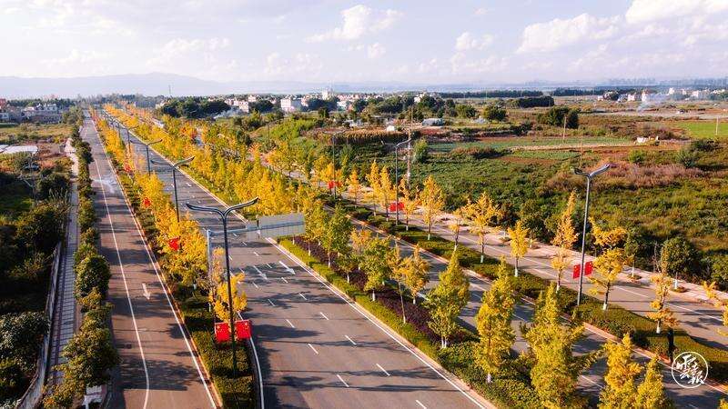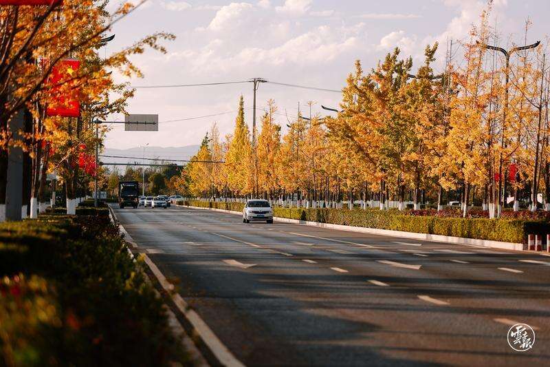 车辆行驶至渔浦路,这条以银杏为主题的特色林荫大道数百株银杏枝繁叶茂,整齐地排列在宽阔的大道旁。来自滇池的风将银杏叶吹拂得沙沙作响,浓郁的秋意点缀了街景,让途经于此的人们视野豁然开朗,顿觉心情大好。
