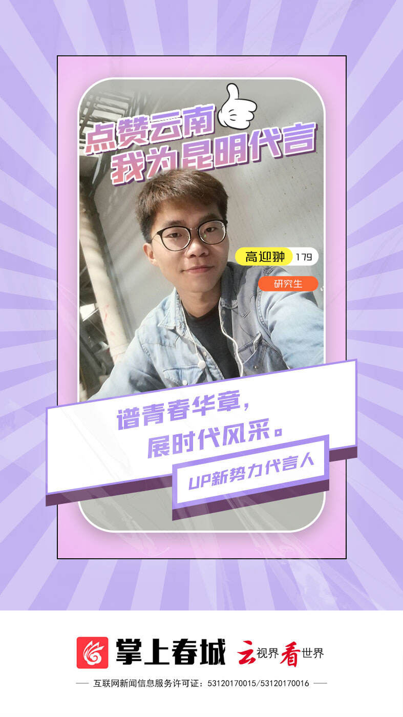 “春城名片”中外闻名、生态建设成果斐然、历史文化底蕴深厚……昆明的美,从不炫耀,这次由你来说!4月28日,“点赞云南·我为昆明代言”主题活动正式开启,活动将寻找2022年最强“代言人”队伍,用自己与昆明的故事,从多元的角度,尽情展示昆明这座网红城市的风情万种。 活动吸引了市民朋友的广泛关注,自启动以来持续火爆,每天均收到大量投稿,今天登上封面的就是“UP新势力”代言人高迎翀。