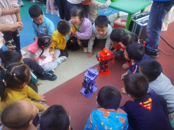 揭牌仪式结束后,由老师组织小朋友们前往室外,自行体验各类科普器械。活动现场,会跳舞的机器人、像火锅盆一样的鱼洗、视窗内变化的场景……这些稀奇的小玩意吸引着曙光幼儿园小朋友的眼球。随后,由林策科技有限公司的老师们集中为孩子们讲解各类科普器械的使用方法,并邀请小朋友们一起动手操作,一起探索那些不为人知的生活“小秘密”。在邀请小朋友上台体验时,科普老师也不忘顺势引导孩子们思考问题、启迪智慧。从体验摩擦鱼洗双耳产生的奇妙水花、柔和电击体验电是什么感觉、用积木搭起一座小桥到用红、绿、蓝三种颜色的光做实验发出粉色光等活动,每个游戏都让孩子们摩拳擦掌,跃跃欲试。随后,无人机的精彩表演更是将整个活动的气氛带到了高潮,只见小朋友们围成一个大圈,伴随着动感的音乐无人机在空中盘旋、起起落落,整齐地变换着队形,小朋友们开心地又蹦又跳,鼓掌声与欢呼声响彻操场。
