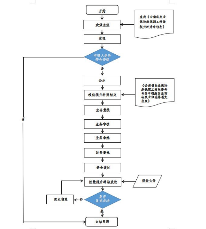 县级失业保险经办机构经办人员按照经办规程为申请人核定失业保险技能提升补贴,生成《云南省失业保险参保职工技能提升补贴申领表》(见附录A表A.1),交由申请人签字确认后,进入公示环节。失业保险技能提升补贴按照申请人取得初级(五级)证书1000元、中级(四级)证书1500元、高级(三级)证书2000元的标准核定(以当年国家、省相关政策规定为准)。