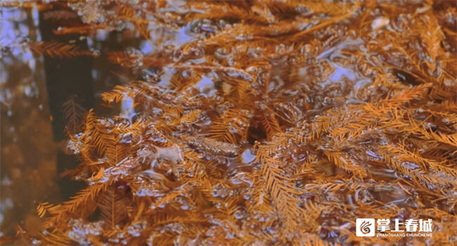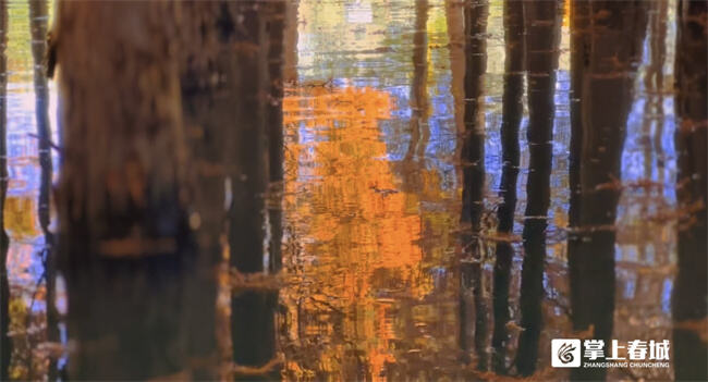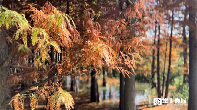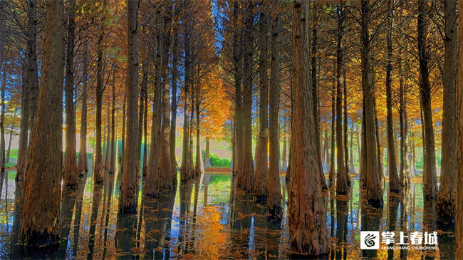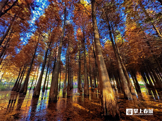 被红色浸染的叶子像幻影一样依附着纤细高挑的树干,一排排水杉林立在水中,倒映格外美丽。
