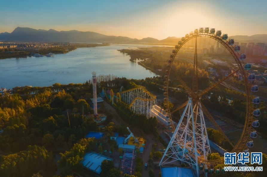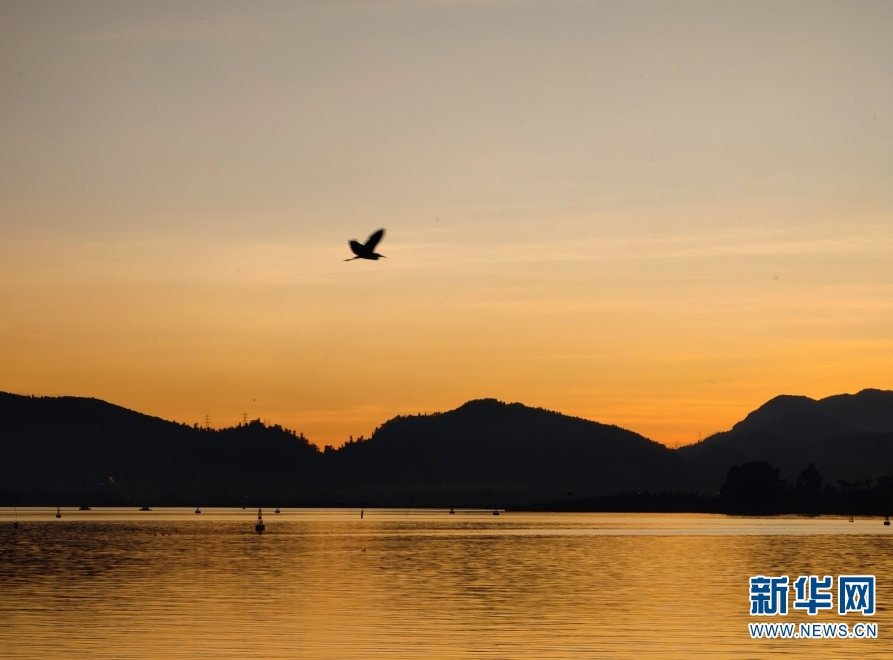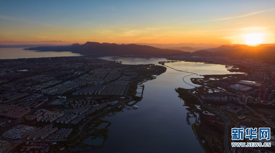 近日,在冬日晚霞的映衬下,云南昆明大观楼美如画,航拍视角下的滇池晴沙万顷,人鸥和谐,暮色迷醉。