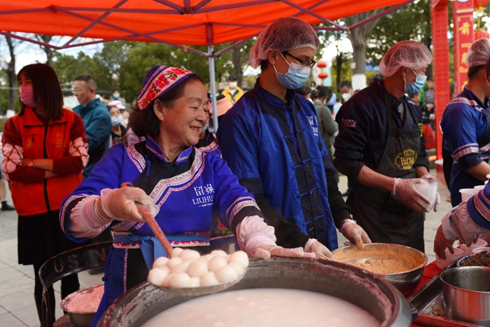 喧天的锣鼓、飞舞的彩绸、高挂的灯笼、欢快的舞蹈……将官渡古镇广场变成了欢乐的海洋。在舞台节目表演区,表演队员身着鲜艳的服饰,舞龙、舞狮、戏曲串烧、猜灯谜等轮番上演,让广大群众在欢声笑语中欢度元宵佳节。在元宵制作体验区,群众围成一圈,在工作人员讲解下,将芝麻馅轻轻沾水、放入糯米粉里翻滚……重复三五次之后,雪白滚圆的元宵慢慢显露出来,放入热锅煮熟后,竞相品尝,喜悦之情溢于言表。在非遗项目展示区,来自官渡区的非遗传承人悉数登场、胶胎炻器制作、彩嵌工艺画、糖画……个个拿出看家本领。同时,现场还组织开展测血压、血糖,垃圾分类有奖问答、发放环保购物袋等文化、卫生志愿服务活动,把党的利民惠民政策送到基层,让群众在轻松愉悦的氛围里感受中华优秀传统文化魅力。
