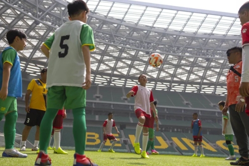 ▲2023年6月,来自青海省玉树州的40名藏族青少年来到首都北京,参加“三江源·北京情·中国心——青海玉树藏族青少年北京行”公益活动。活动期间,孩子们来到北京工人体育场,与国安少年足球队开展训练及交流活动。 才扬摄