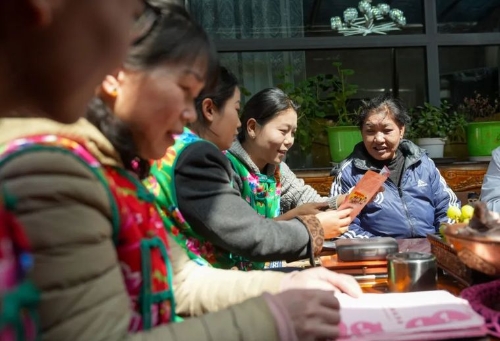 ▲在西藏拉萨市堆龙德庆区东嘎街道南嘎社区,总能看到穿着鲜艳花衣裳的姑娘们为辖区群众维护权益、调解纠纷,提供法律咨询、心理咨询等,群众亲切地称她们为“花大姐”。 新华社记者 晋美多吉 摄