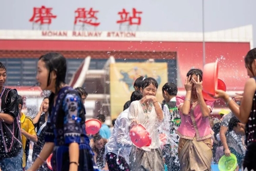 泼水狂欢活动将磨憨火车站站前广场变成欢乐的海洋。