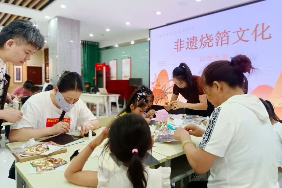 在烧箔画体验中,孩子们用胶水勾线、覆贴金箔、细致扫箔,一幅幅闪耀着金属光泽的民族图案逐渐成型,在光影交错中展现非遗技艺的精妙。