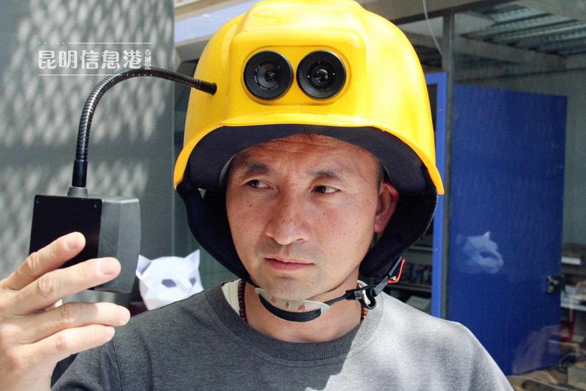 这个类似“金龟子”的热成像侦查头盔是田锦林的专利之一。两个大眼睛分别是普通摄像头和热成像摄像头,通过面前的显示屏,可以清楚地看到浓烟滚滚的火场中人的准确位置。头盔还可以发射无线电信号,使场外的指挥员能够及时了解火场情况。