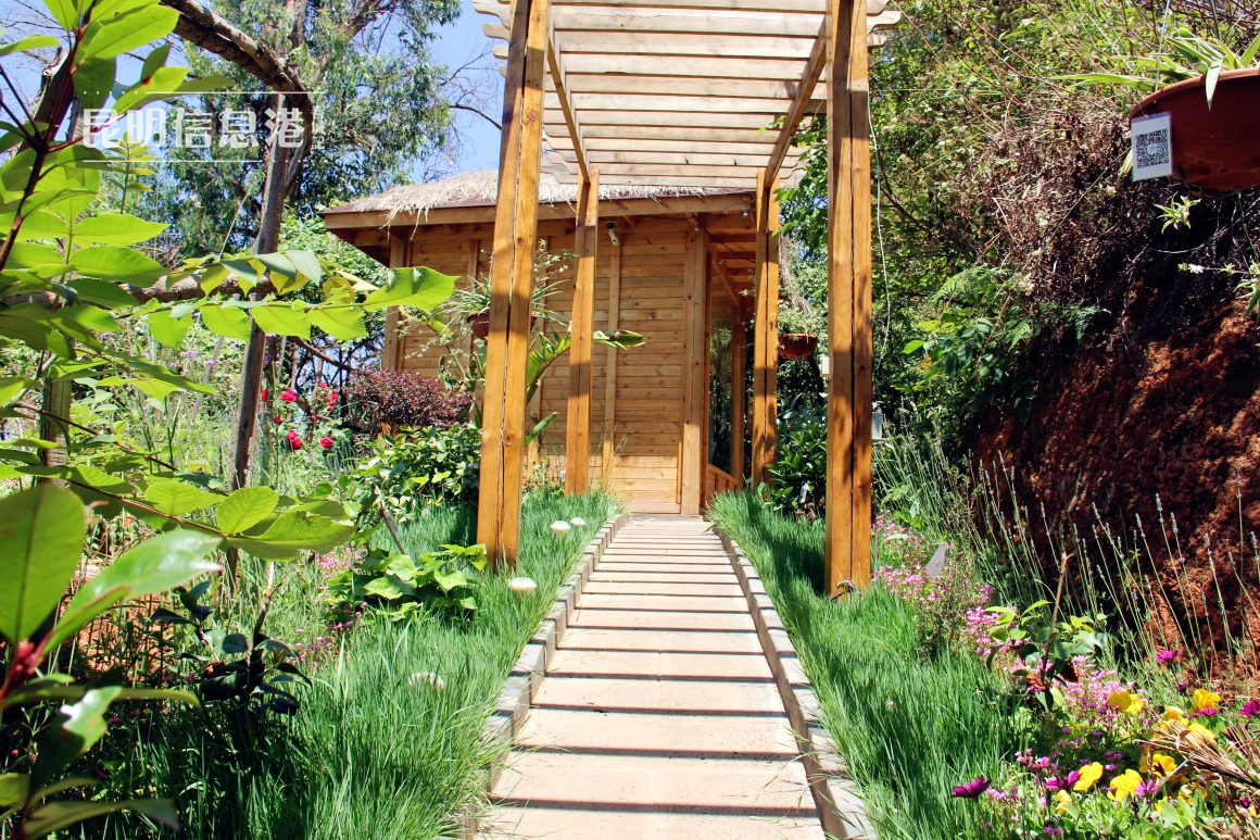 一路向前,地势缓缓攀升。木质的长廊被各类花草掩映,草地中的照明灯在阳光下蓄积着能源。